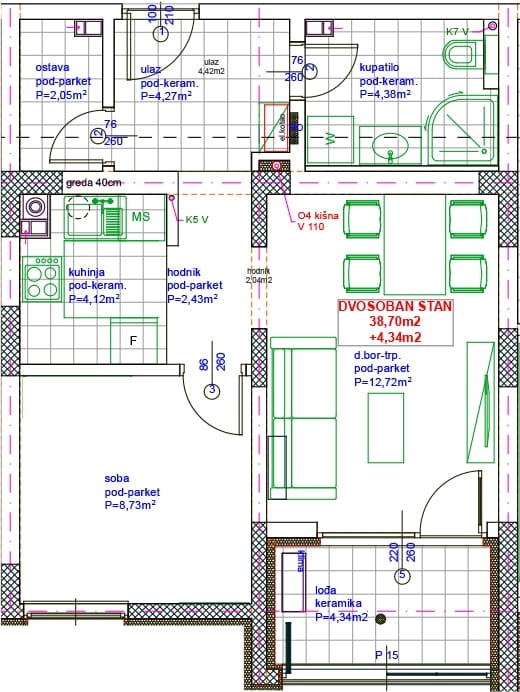 Dvosoban stan – 43,04 m2 (38,70 m2 + 4,34 m2)